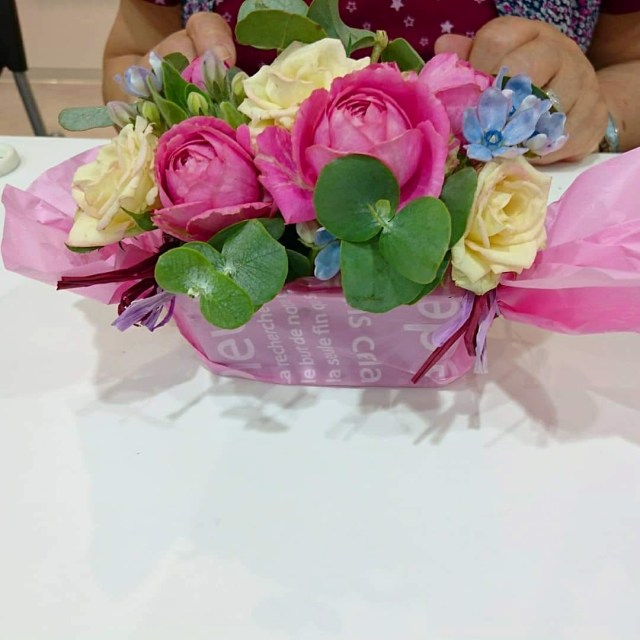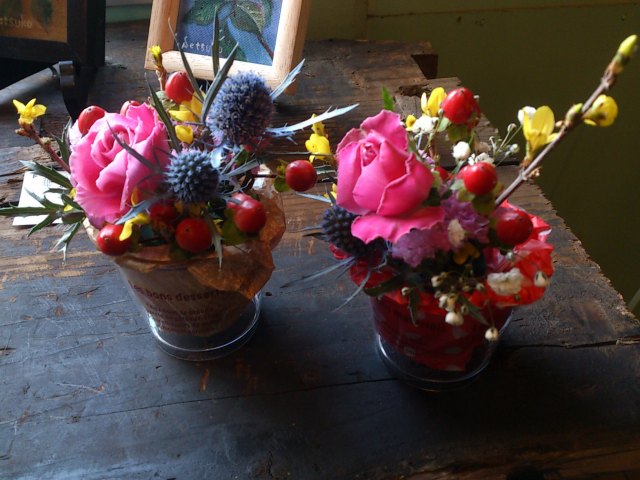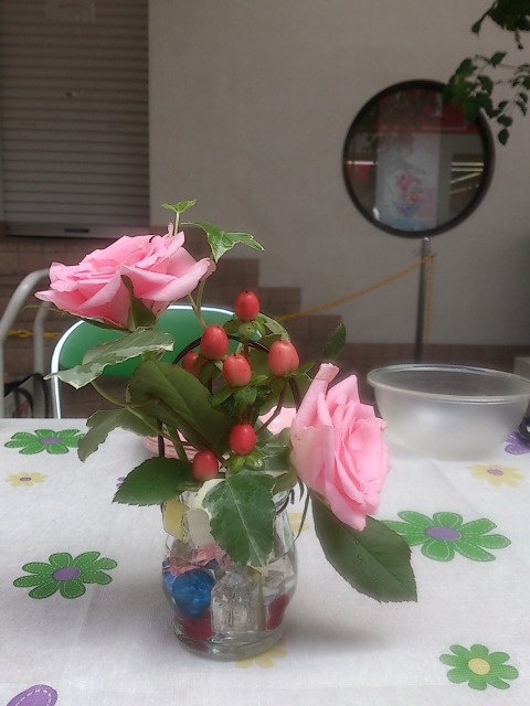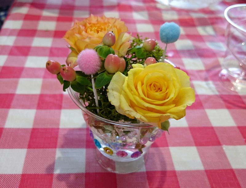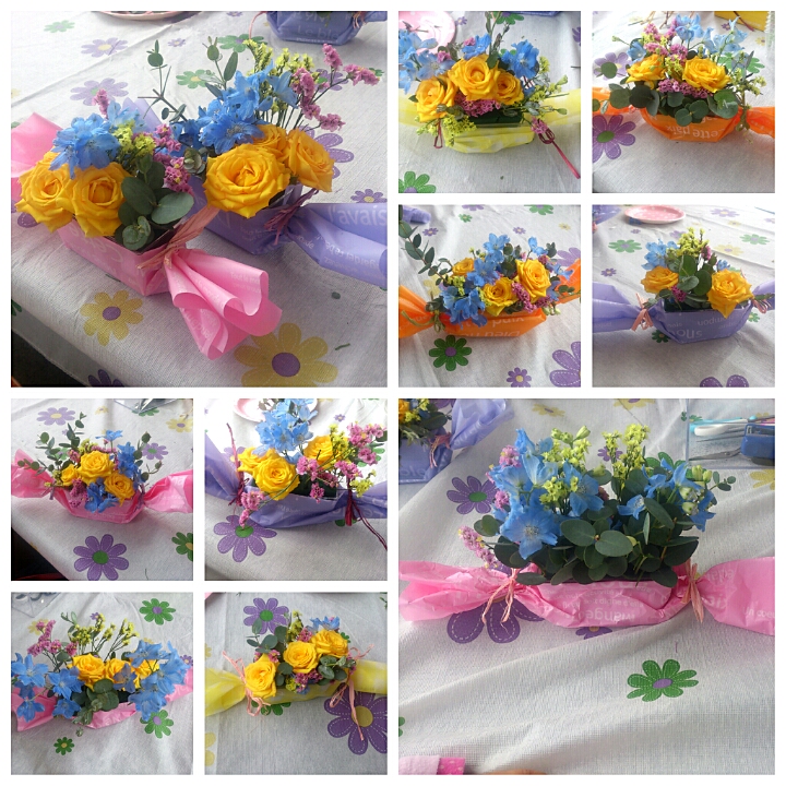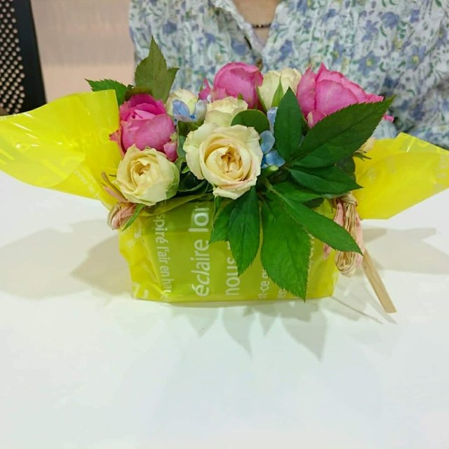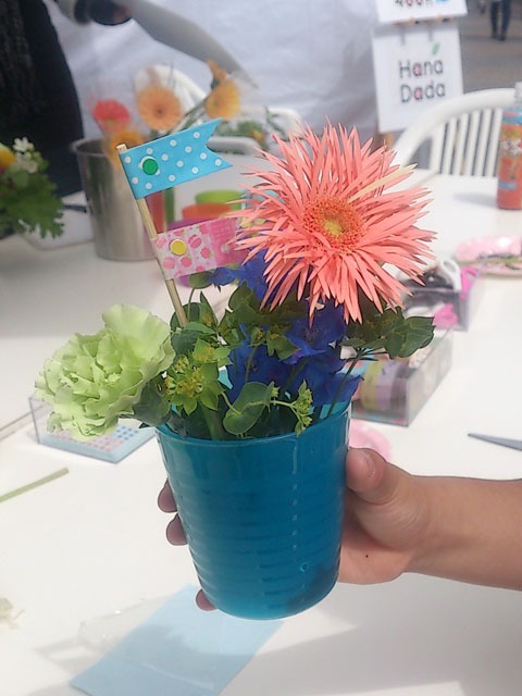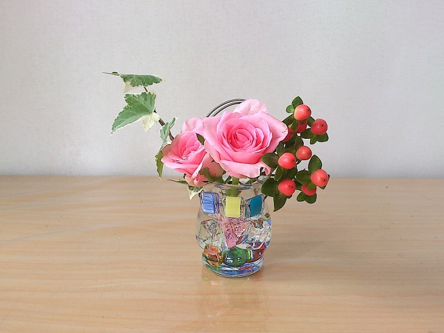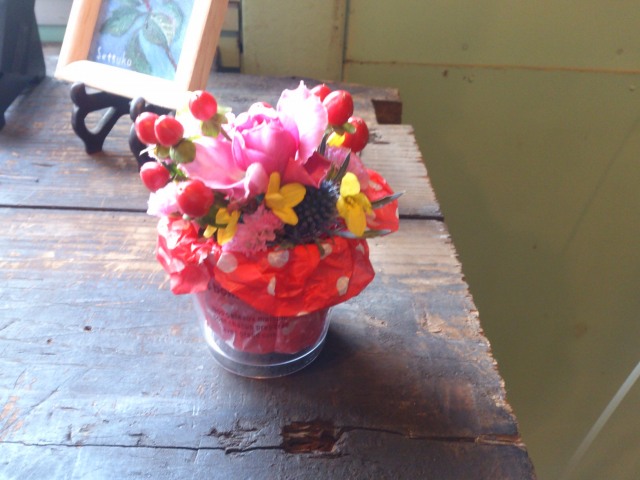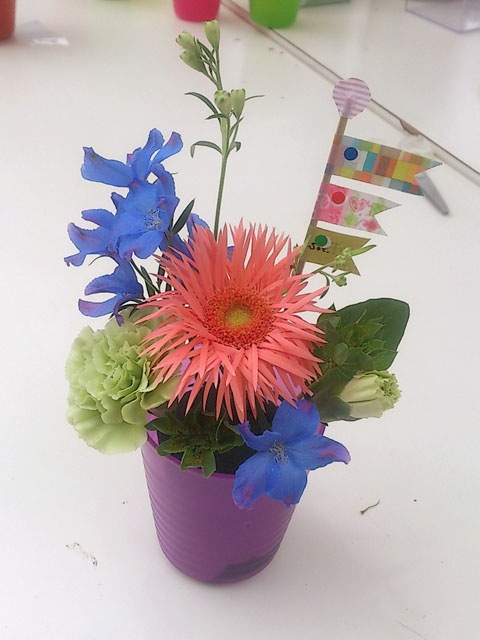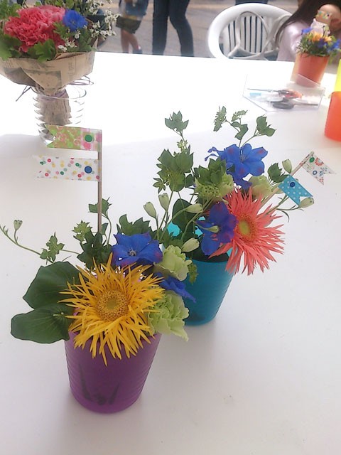 カラフル花器に楽しく飾っていただきました。