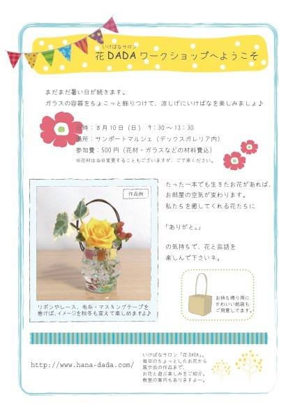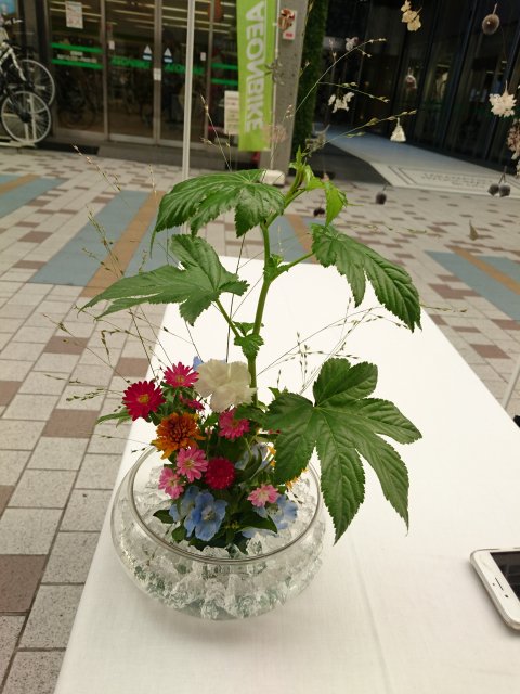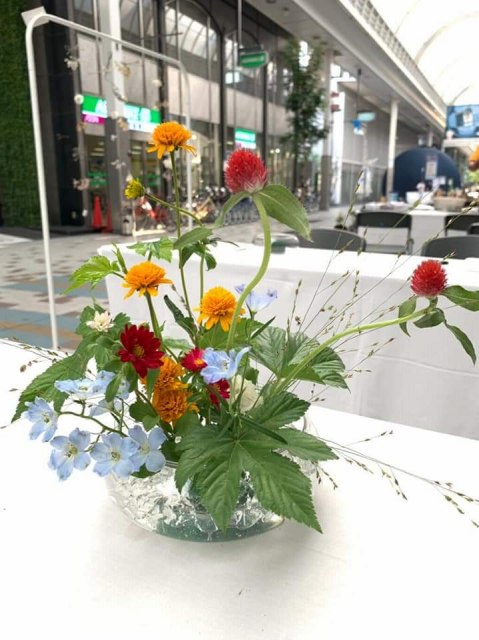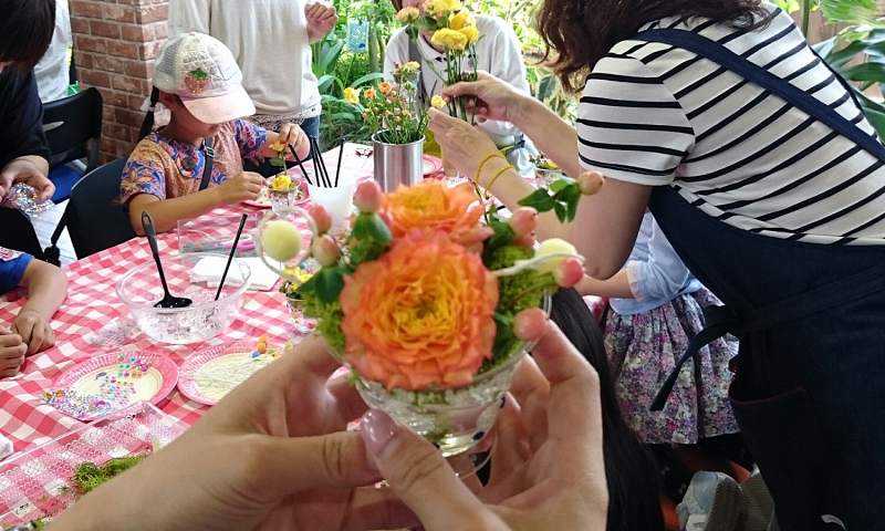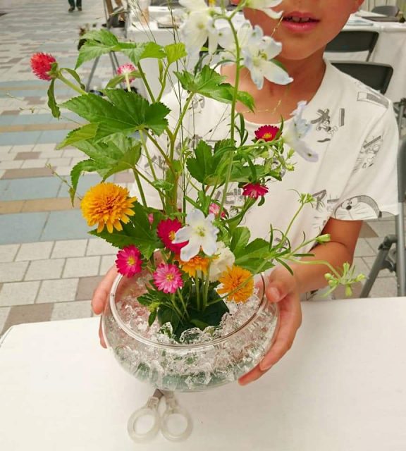 小さなお子さんもたくさん参加してくれました。 暑い中ガラスを使った花器で涼しげに飾り付けて。