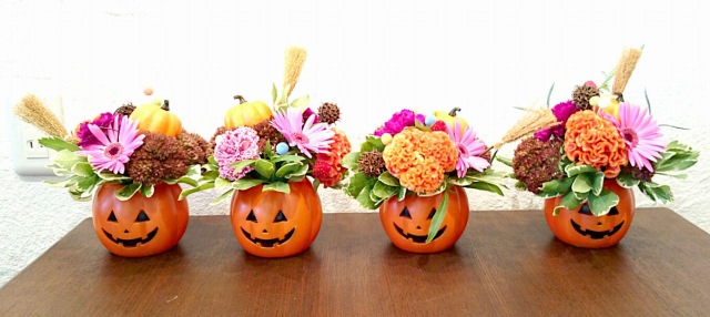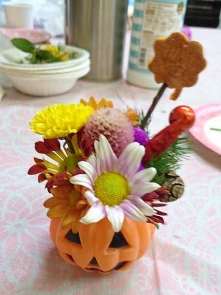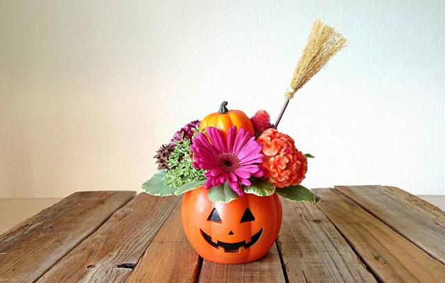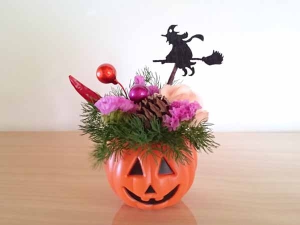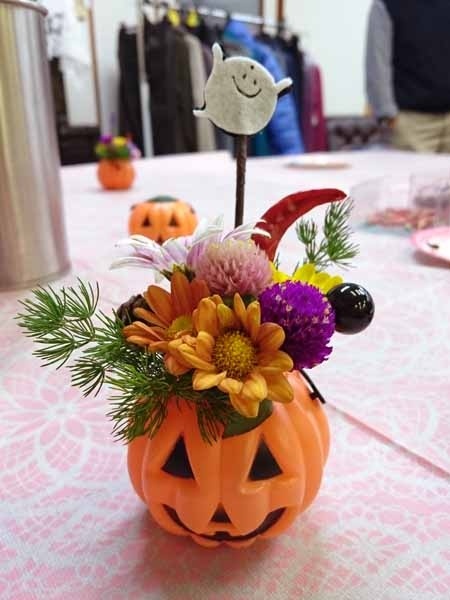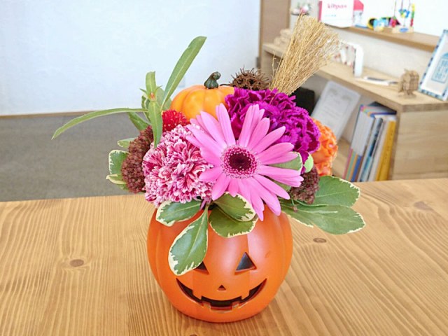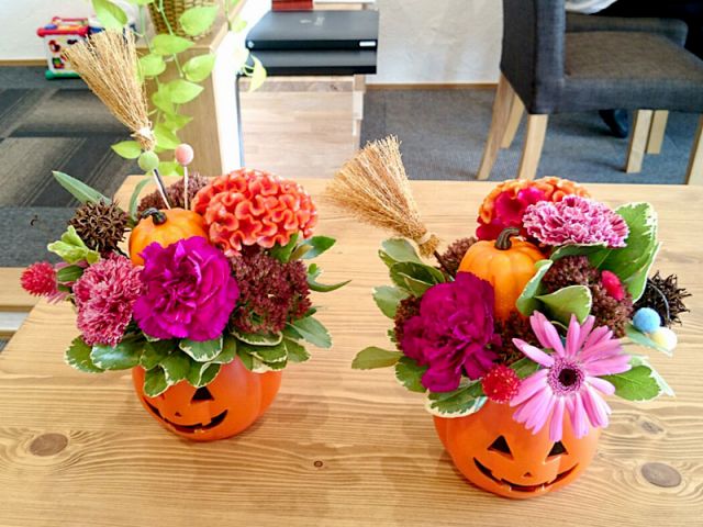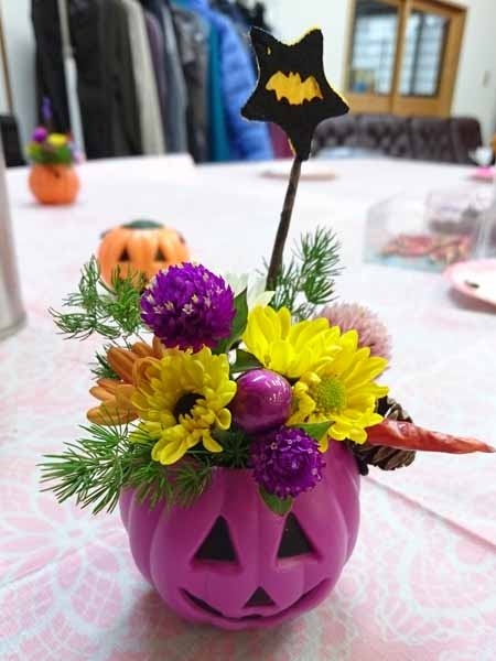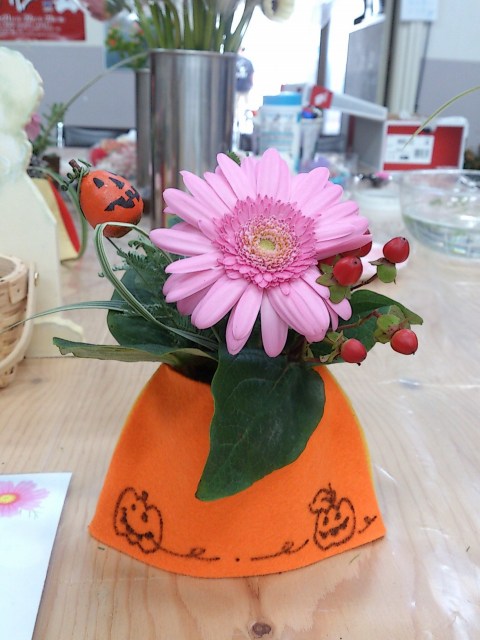 ハロウィン間近という事で、生花と合わせたアレンジ作り。