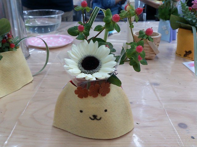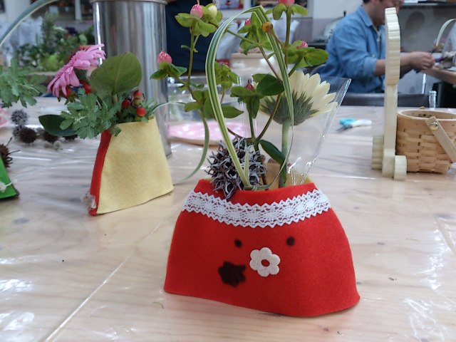 展示会会場で「小さな花」のテーマに合わせて、自由に飾り付けた花器にガーベラ・ソリダコなどをいけてもらいました。