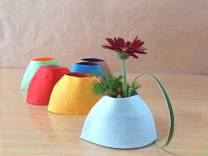 フェルトを使ったバイカラーの花器。フェルトシールや毛糸で自由に飾り付けて、お部屋のインテリアのアクセントにも。