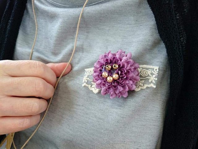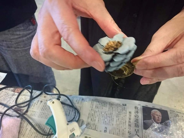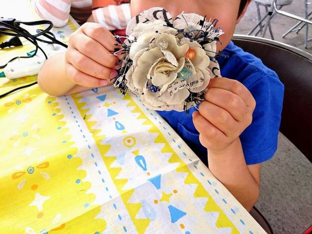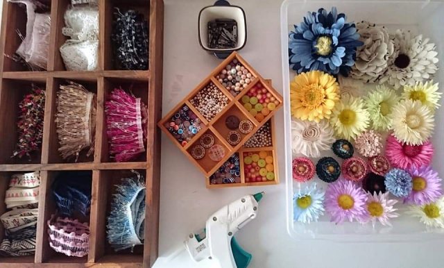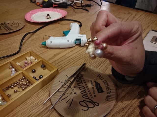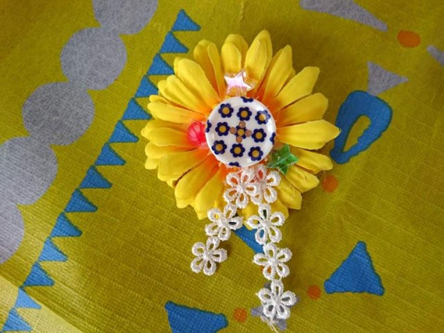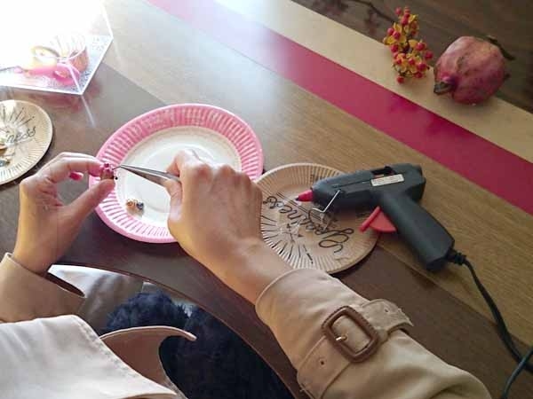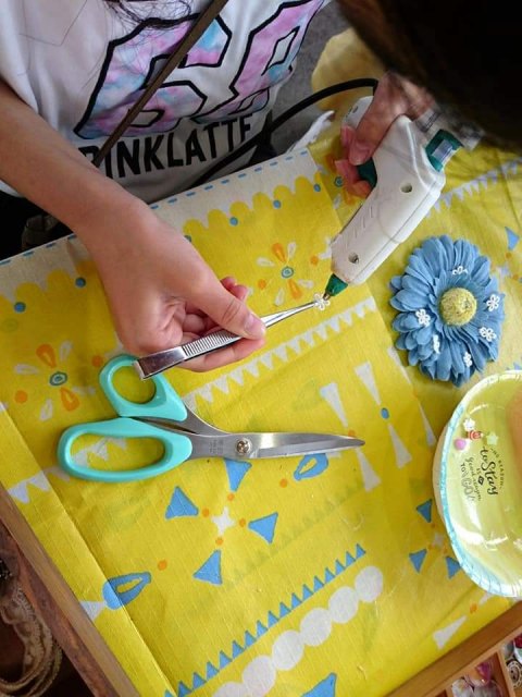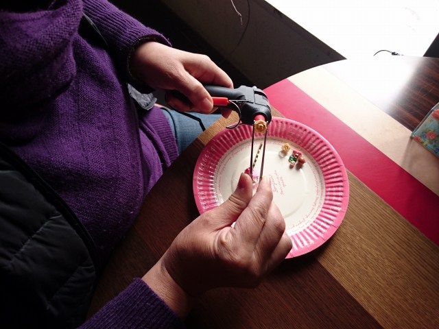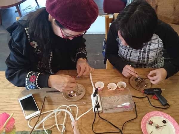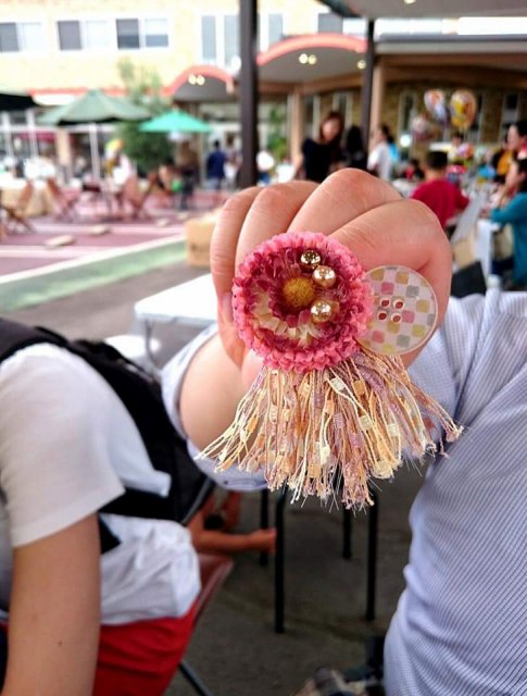 アーティフィシャルフラワーやリボン、ボタン、ビーズなどを使ってグルーガンで楽しくブローチ作り。