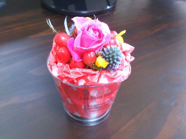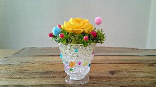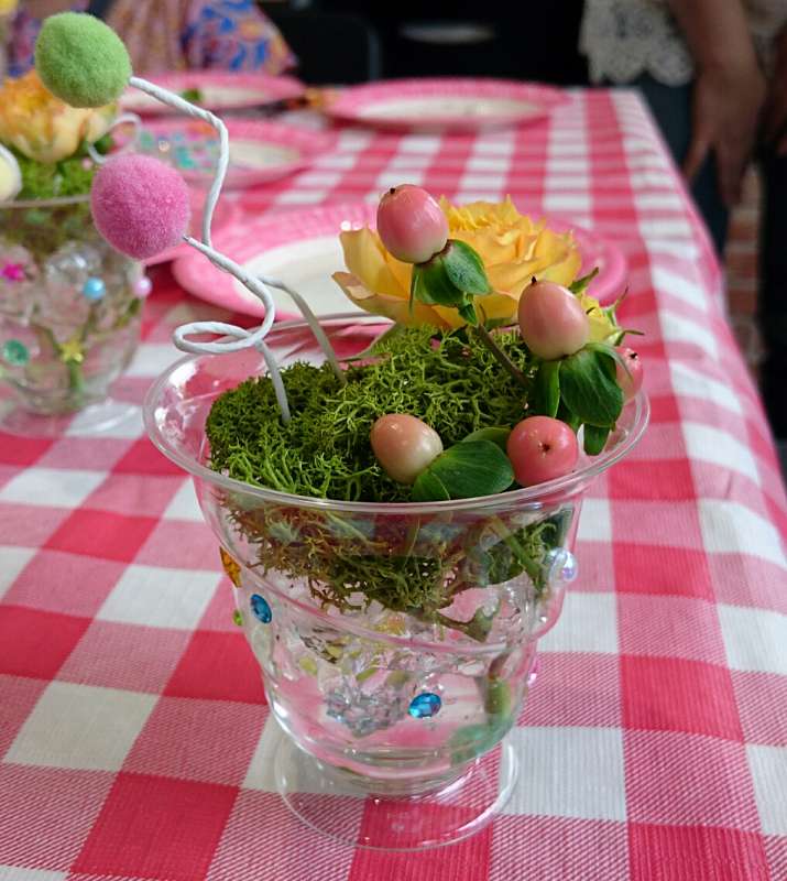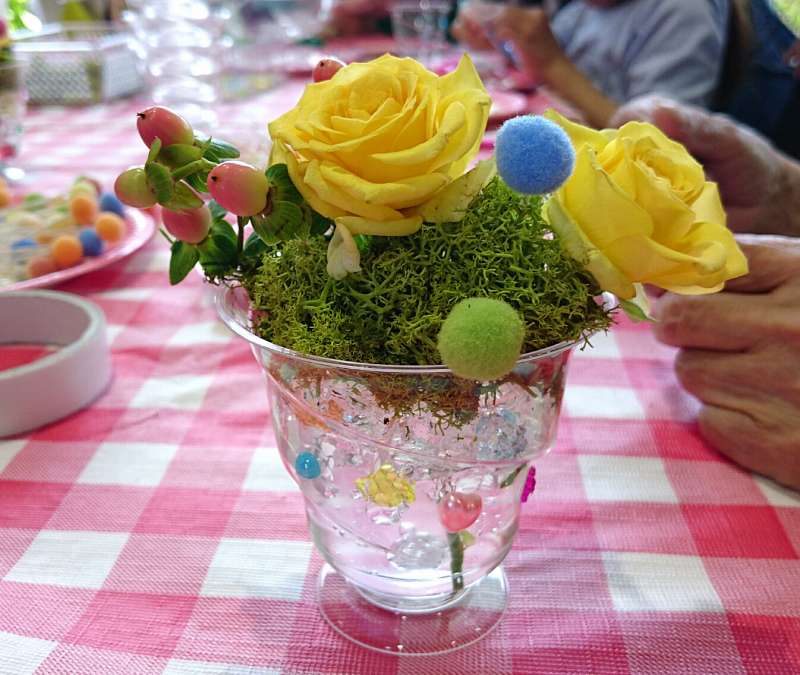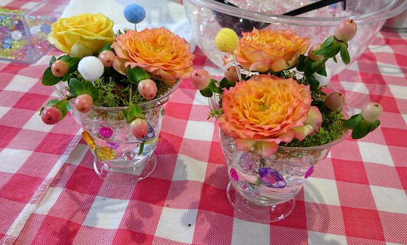 今回はスイーツのような小さな花をテーマに、 ゼリーカップのような涼しげな花器にデコレーション。