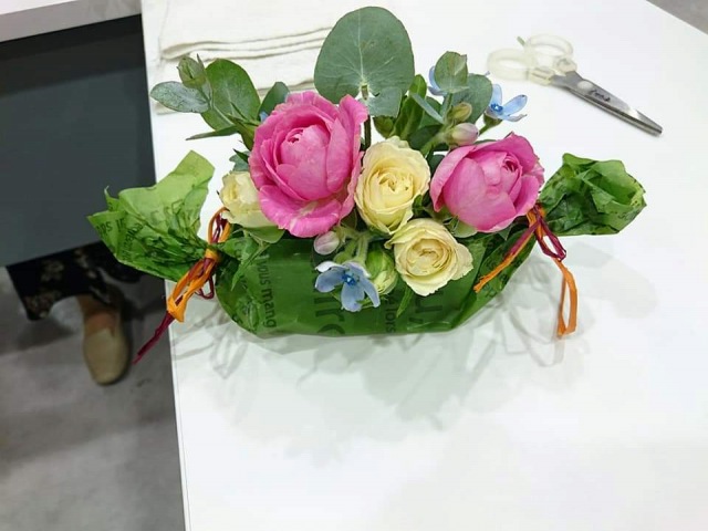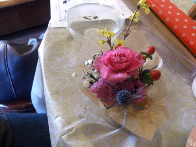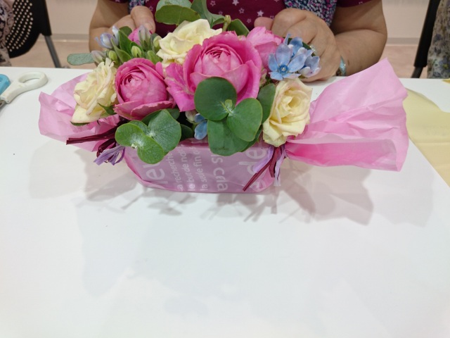生花のアレンジと店主特製のマドレーヌと共にラッピングまでチャレンジ。