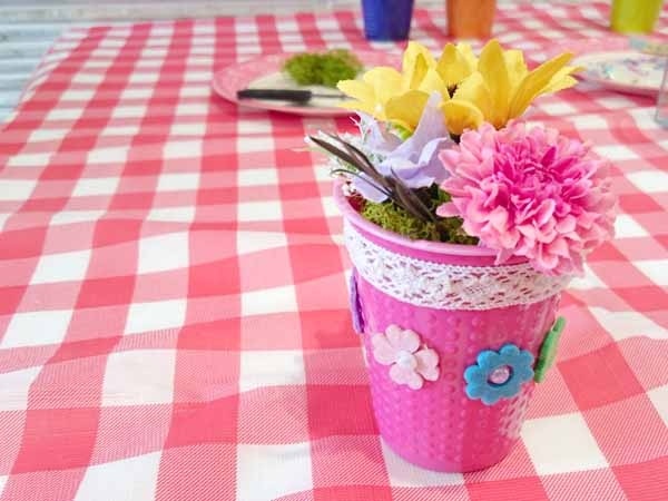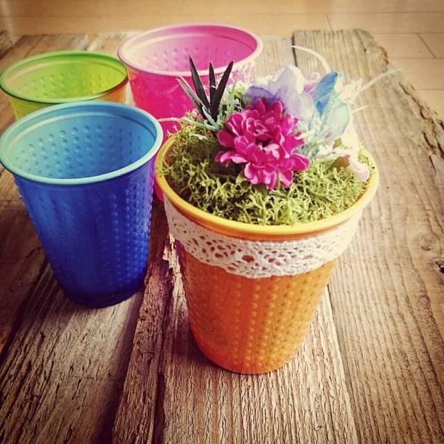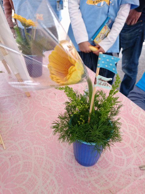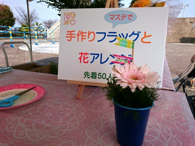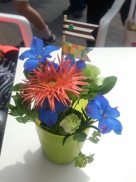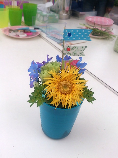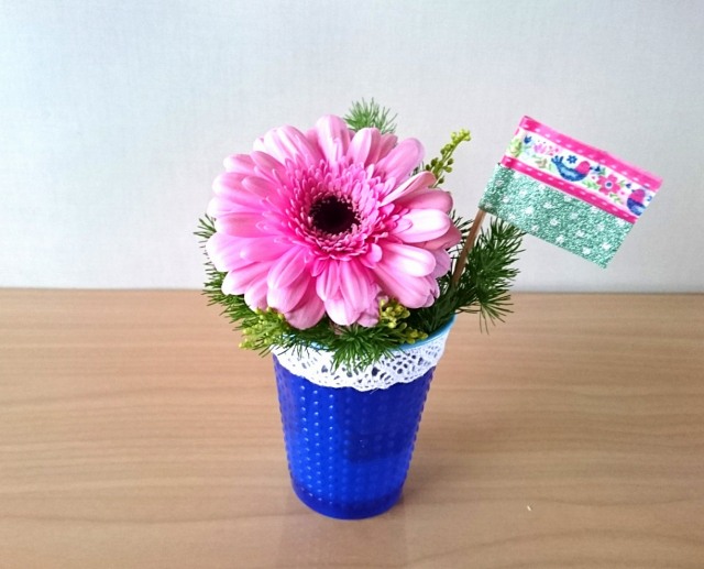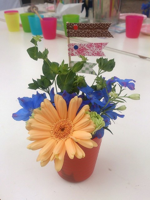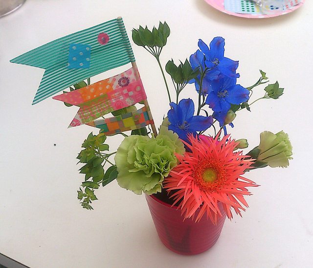 チームカラーのブルーのコップにミニアレンジを楽しんで、仕上げはマステを使ったフラッグ作り。
