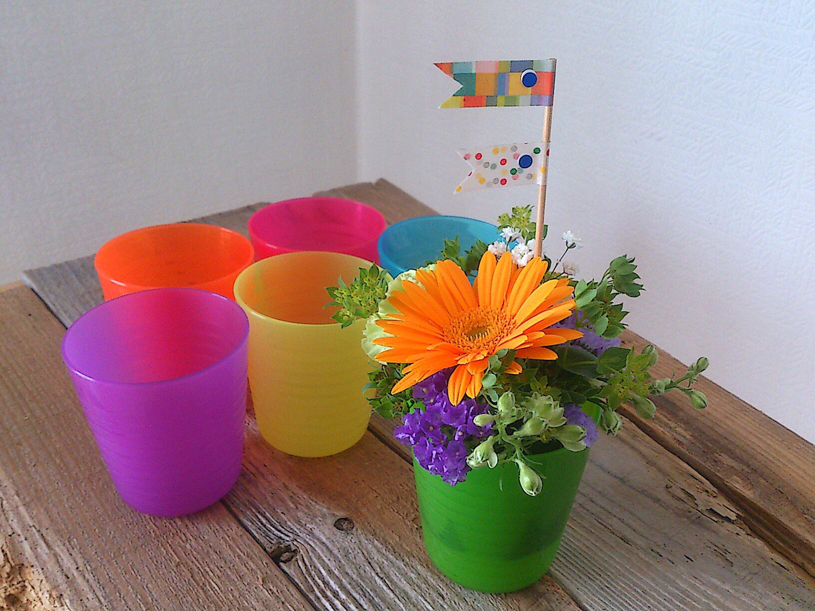 「こどもの日」にちなんで、かわいいカラフルコップにマスキングテープで作るこいのぼりとお花を飾りました。