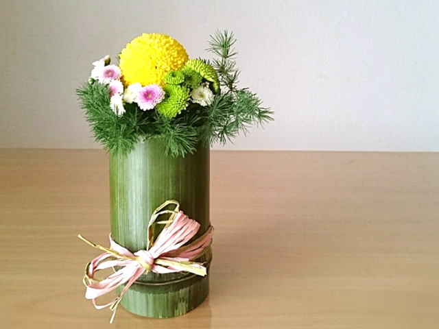 展示会会場で、ポップでまぁるい菊をメインにした花たちを青竹に。