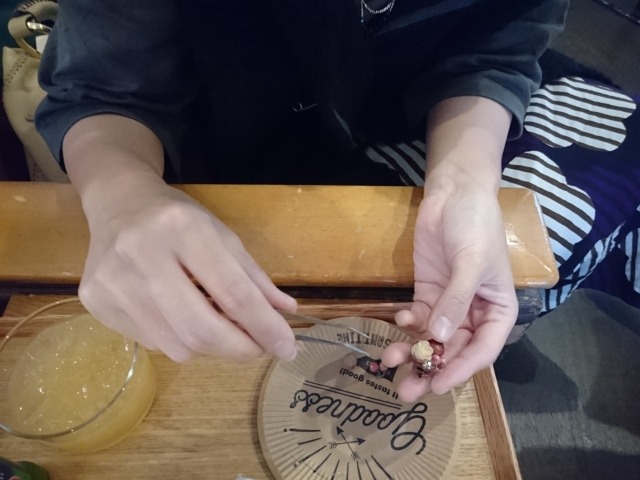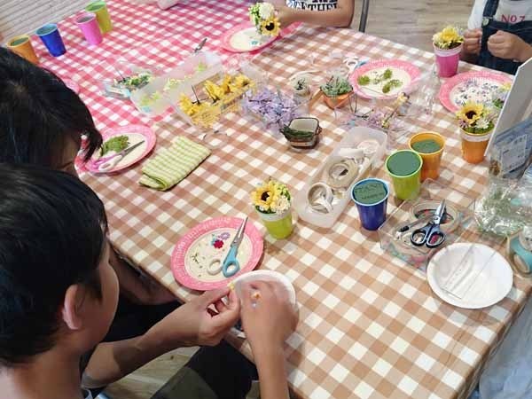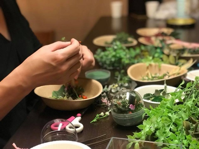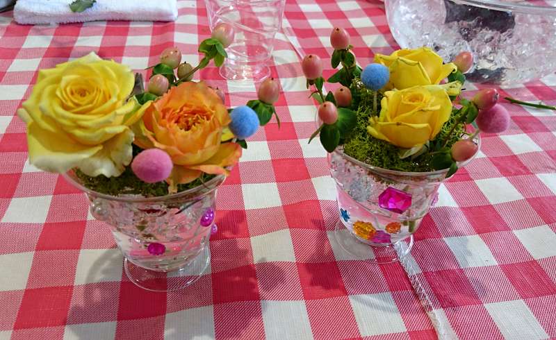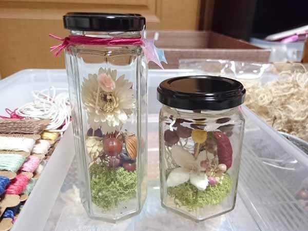 好きなビンとプリザやドライなどを使って、ボトルフラワー作りを楽しんでいただきました。