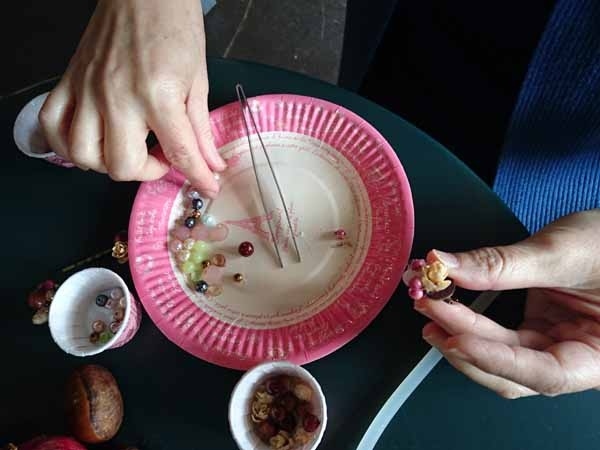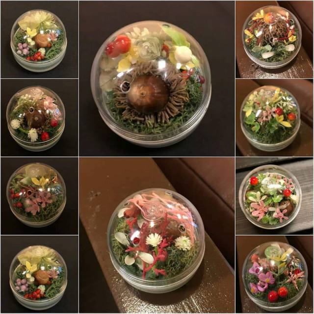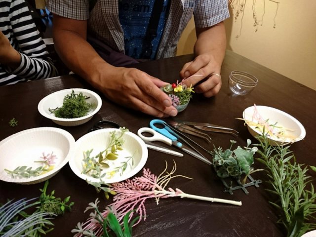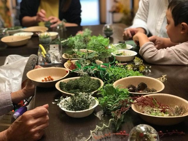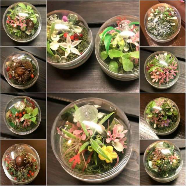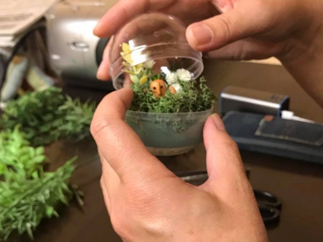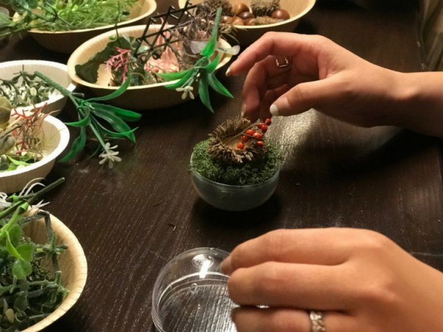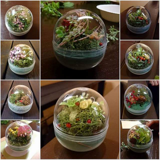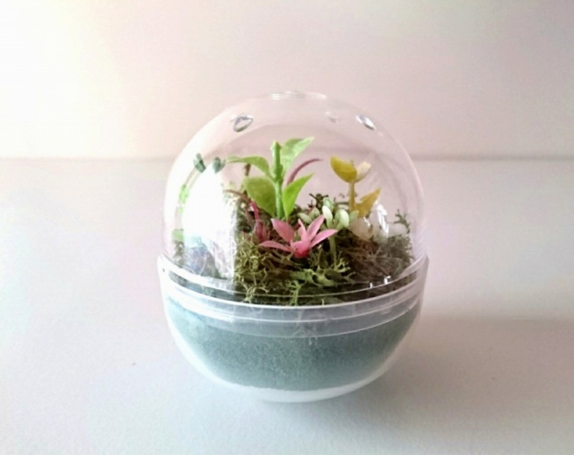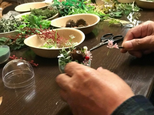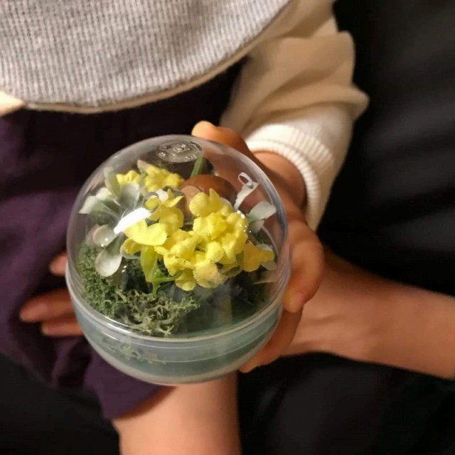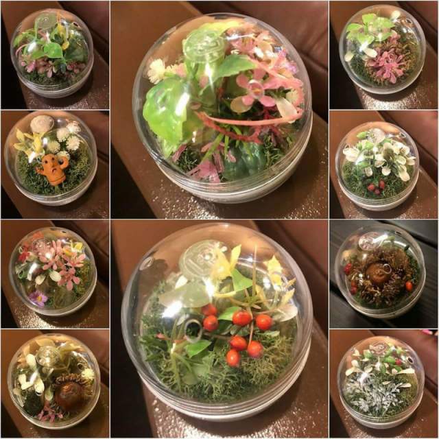 花DADA展覧会会場で開かれた無料ミニワークショップ。 ガチャガチャの透明ボールの中に小さな森を作ってもらいました