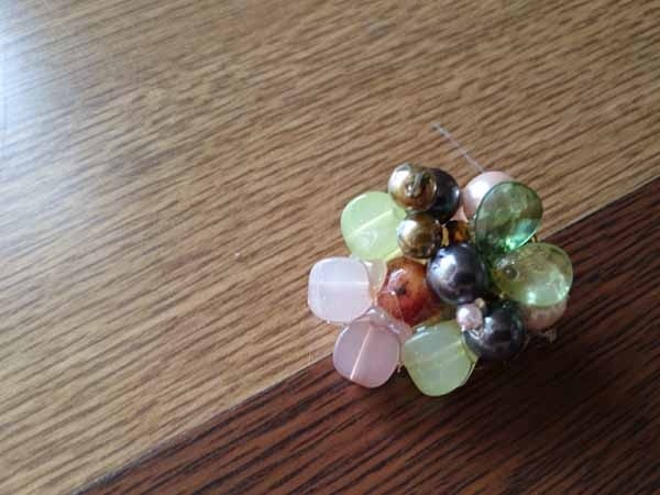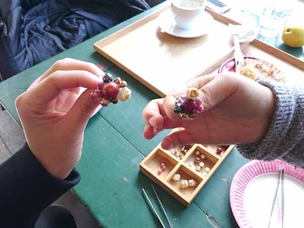 みのりのテーマに合わせて、木の実やビーズなどで思い思いのアクセサリー作り。