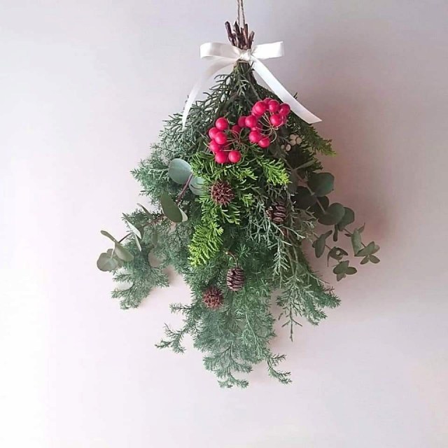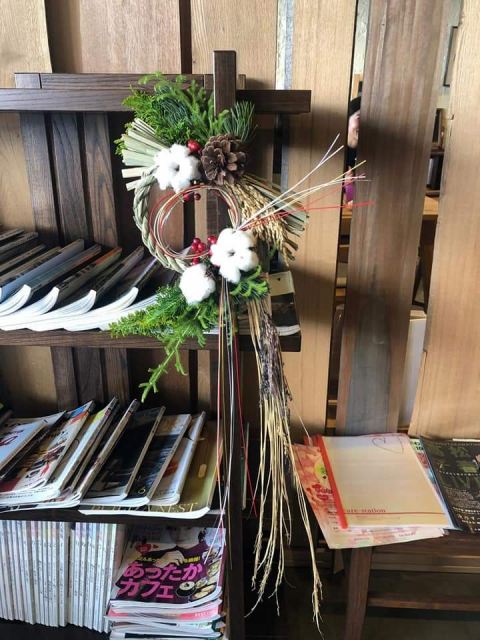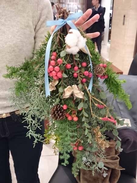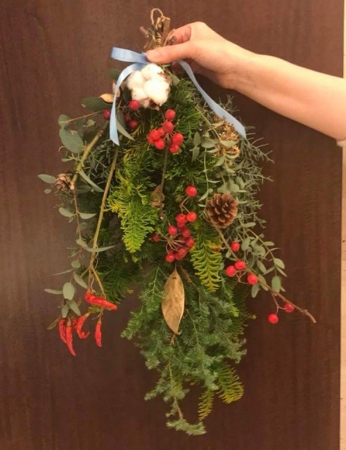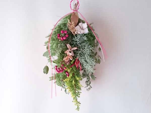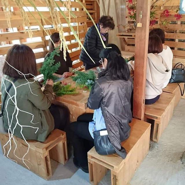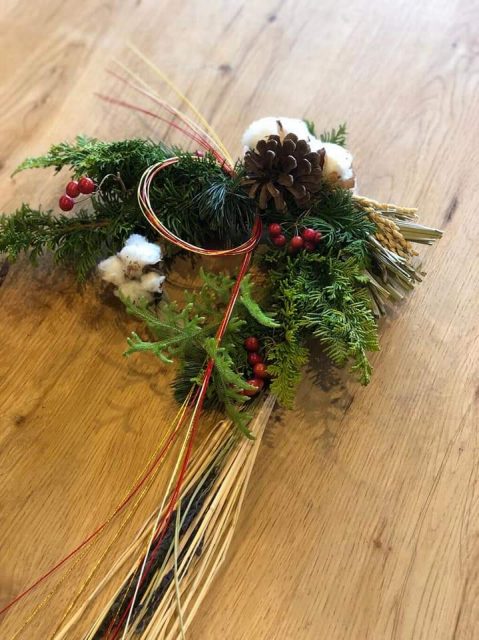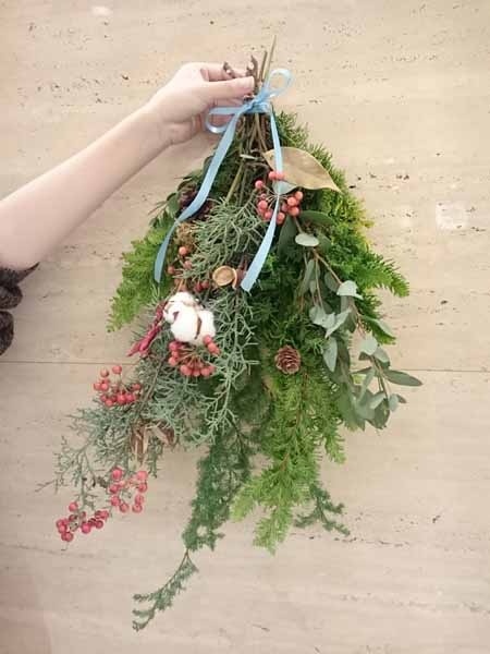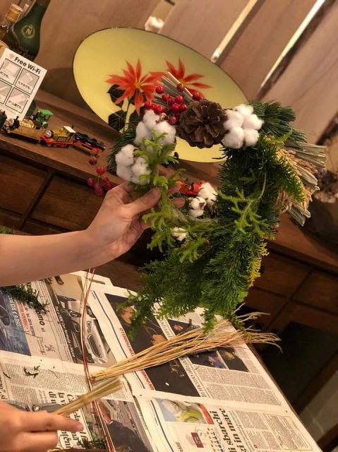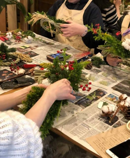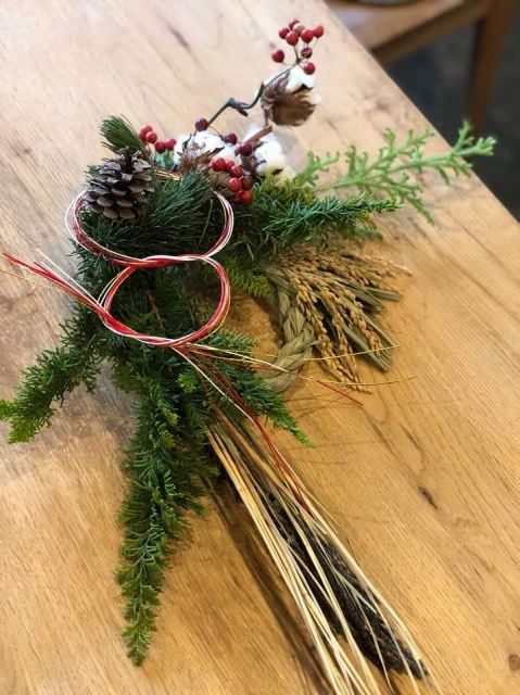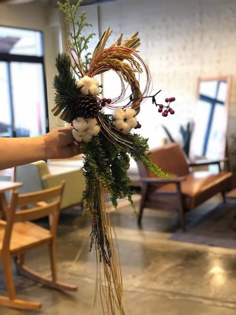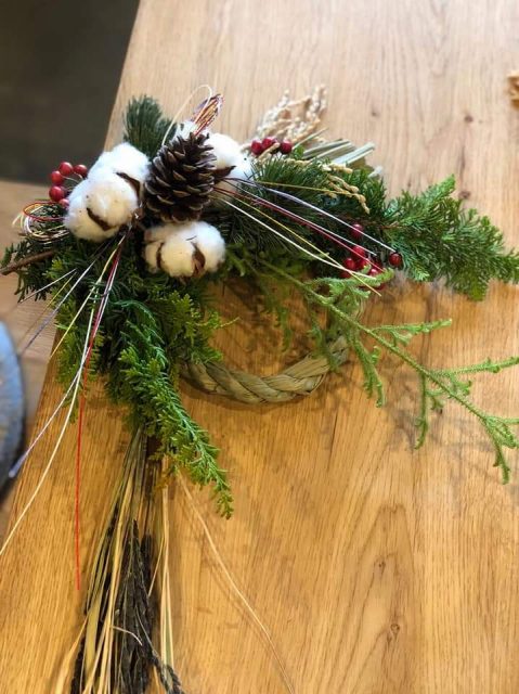 幸せを授けてくれる年神様をお迎えするしめ飾り。生の花材を使って自由に手作りしていただきました。
