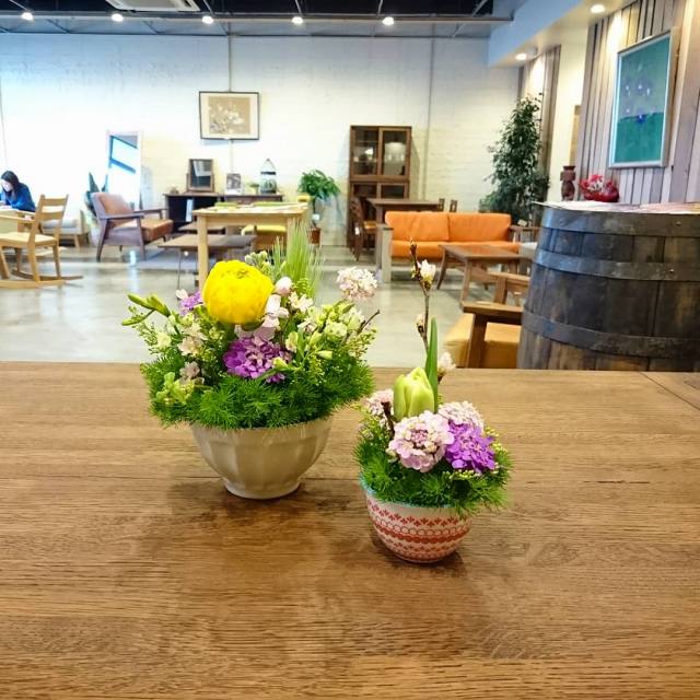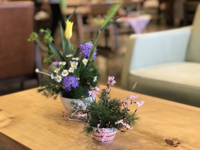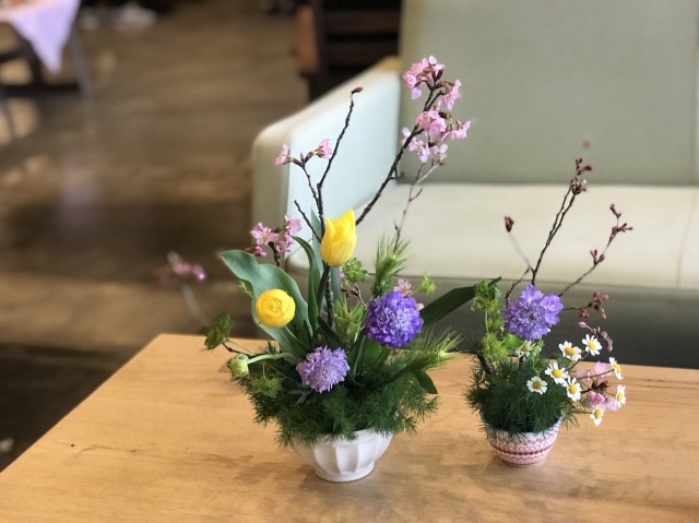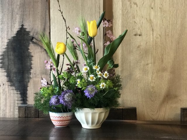 普段使いの2つの食器を使って、桜やスカビオサなど春色の花を自由に生けていただきました。
