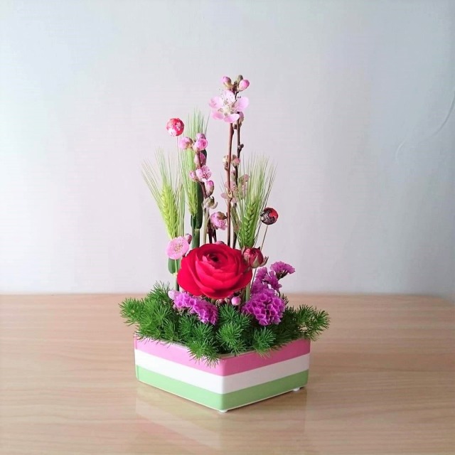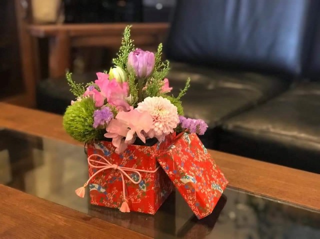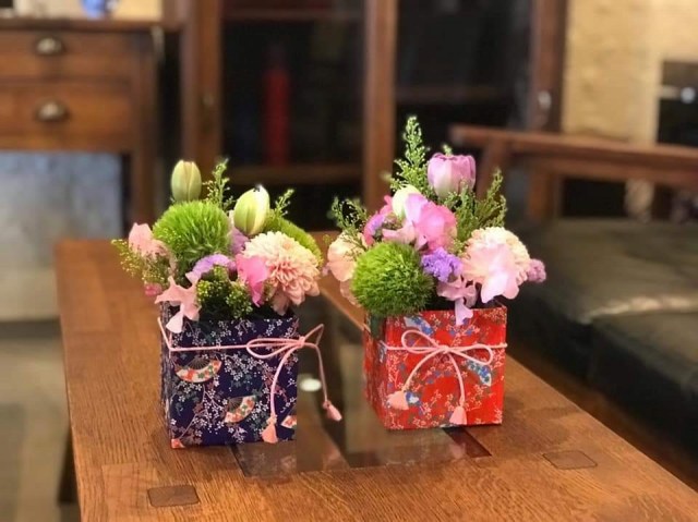 ひなまつりの日に。友禅和紙を使って花器を作り、春色いっぱいの花々をアレンジ。