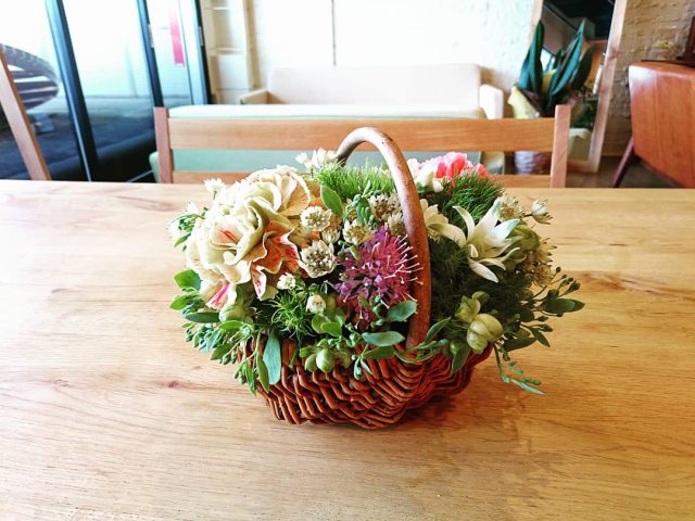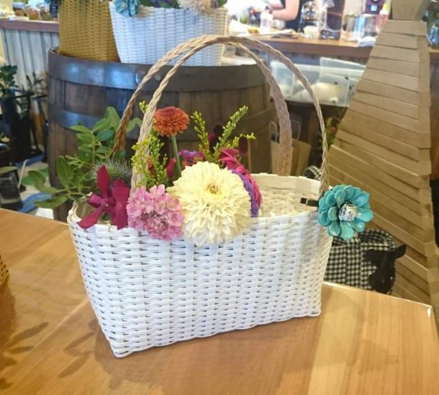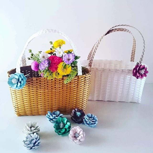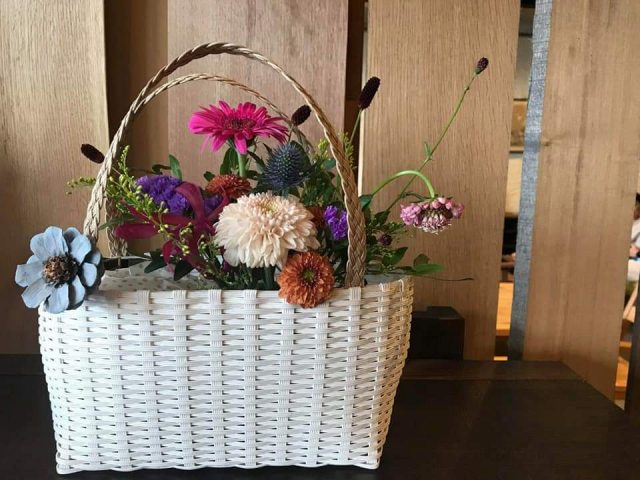 クラフト作家のうえはらたかこさんが、このワークショップのために 作ってくださった2色のカゴを使って作る秋の花アレンジ。