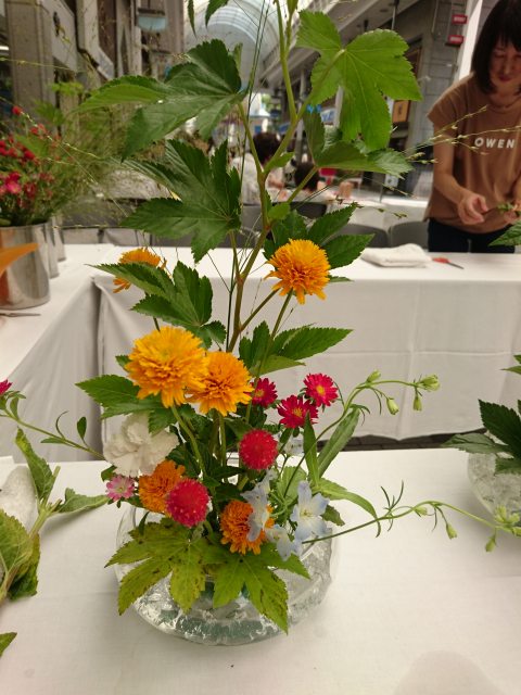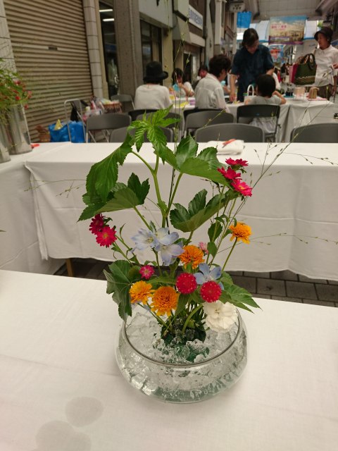真夏の商店街。透明の花器とゼリー、涼やかな花材を使って夏のアレンジを楽しんでいただきました。